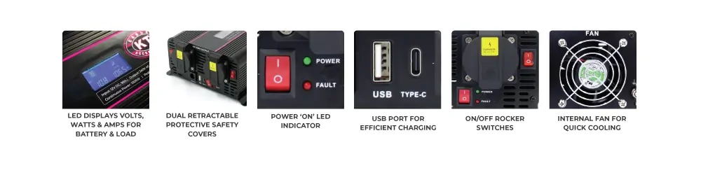 All models feature dual 240V Sockets ( AS/NZS 3112 ) with retracting protective covers, 3 x Illuminating LED ‘On/ Off’ rocker switches, a USB Type A Output & USB Type C Output for efficient charging & powering USB devices. KT PURE SINE WAVE Inverters are easily mounted to surfaces such as walls or floors via mounting hardware included. The internal fan allows for quick cooling to ensure the inverter performance is optimum and operating at a safe temperature.
