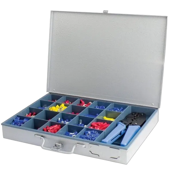 Insulated Terminal Kit Assortment with Ratchet Crimper, Steel Heavy Duty Case, 1101 Pieces. Features a mix of the most commonly used Insulated Blade Terminals, Ring Terminals, Bullet Terminals, and butt Splice Terminals with a Ratchet Crimping Tool.