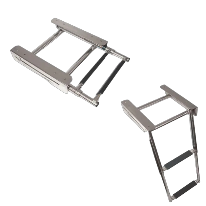 Telescopic Stainless Steel Ladders - Retractable Under Platform Ladder RWB265 A range of telescopic stainless steel boarding ladders in 2 different styles with 2 or 3 steps available in each style. Compact and efficient telescopic design. Stainless steel steps have moulded black vinyl tread to facilitate easy boarding. The stainless tube diameter is 32 / 25mm diameter for 2 step and 32/ 25/ 19mm diameter for 3 step. Mounts permanently under platform or recess. Ladder closes to only 400mm length and slides back into bracket for permanent under platform mounting. Part NumberSizeLengthWidth RWB265 2 Step 350mm-640mm 300mm RWB266 3 Step 365mm-890mm 300mm