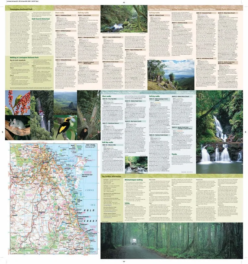 This National Park Map has been produced at a scale of 1:25,000 and therefore has great track detail. The text describes 24 walks, including useful information for walkers such as the classification and amount of time to complete. The walks range from easy rainforest tracks of half an hour to the seven-hour walk from Binna Burra to O'Reilly's. To make it easy to find a walk the walks are grouped as short, half-day and full day.