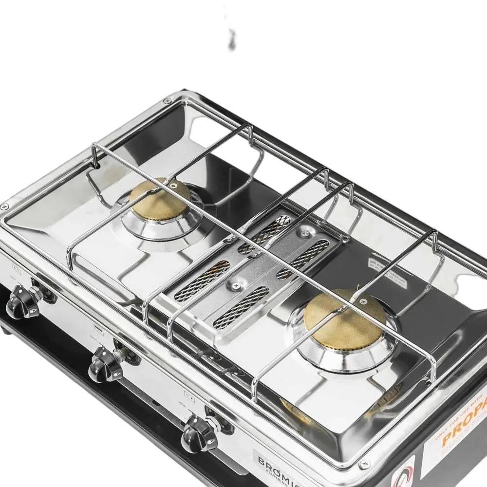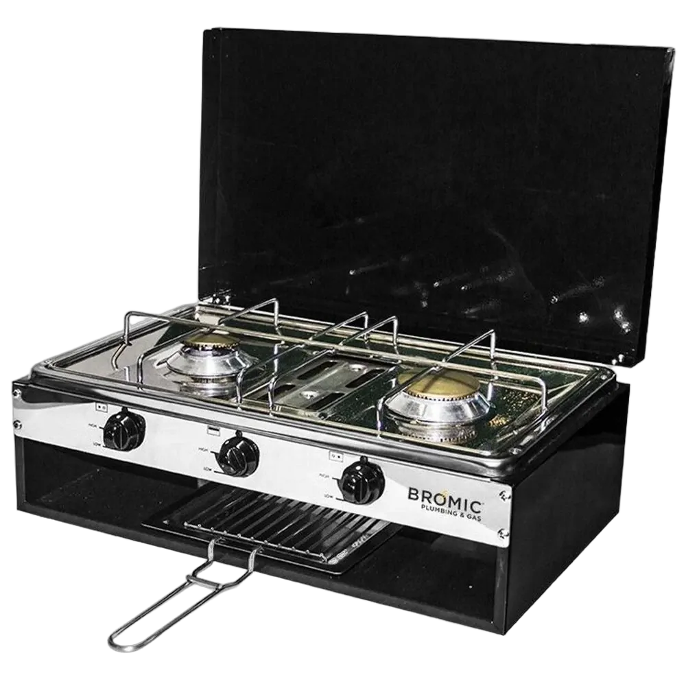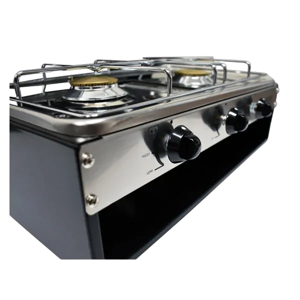 The Camper-Lido Junior Deluxe 2-Burner with Grill is a sturdy and compact cooker with grill, specifically designed for indoor or outdoor use in caravans, recreational vehicles and weekenders. This LPG deluxe camp cooker is a low pressure cooker that is also suitable for use indoors, such as in Caravans and Motorhomes.