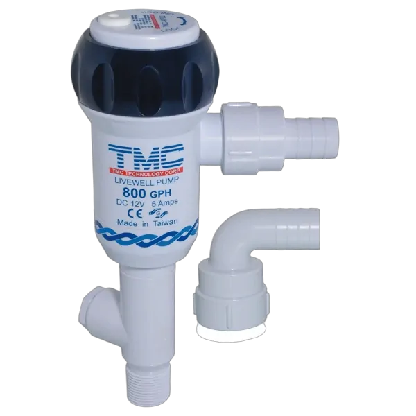 The TMC Livewell Pump is designed for easy installation, available in three different models to suit your requirements. The twin-port design provides the convenience of using one intake for both Livewell and a washdown pump connection. A breather hole allows the pump to clear trapped air while the boat is travelling through rough water or anchored.