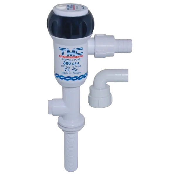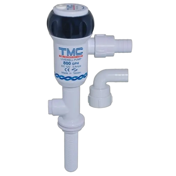The TMC Livewell Pump is designed for easy installation, available in three different models to suit your requirements. The twin-port design provides the convenience of using one intake for both Livewell and a washdown pump connection. A breather hole allows the pump to clear trapped air while the boat is travelling through rough water or anchored.