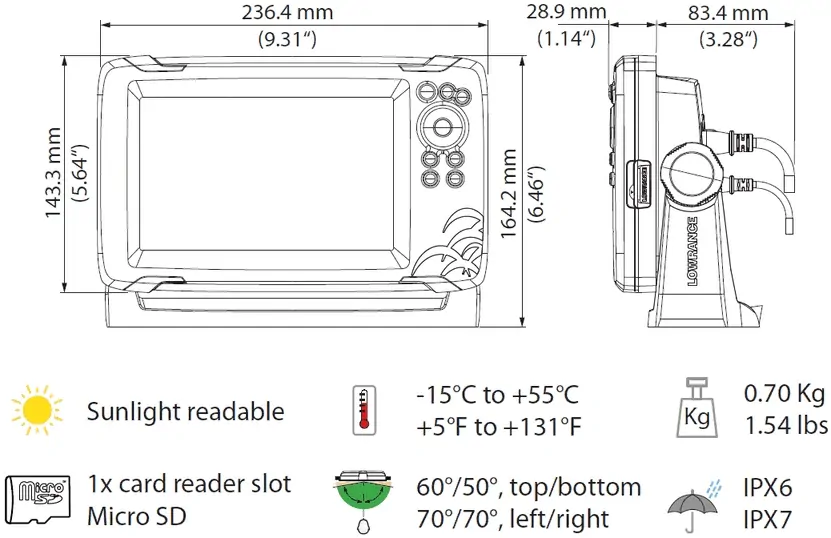 | Max Sonar Range | 183m (600ft) side-to-side Max 300ft to each side |