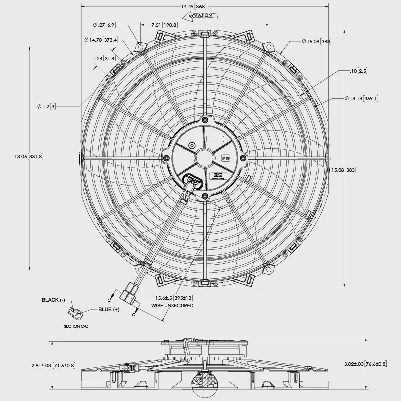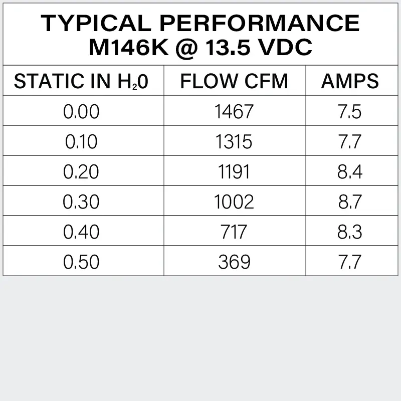 11 in., low profile, reversible “S” blade fan with 130 watt motor.
