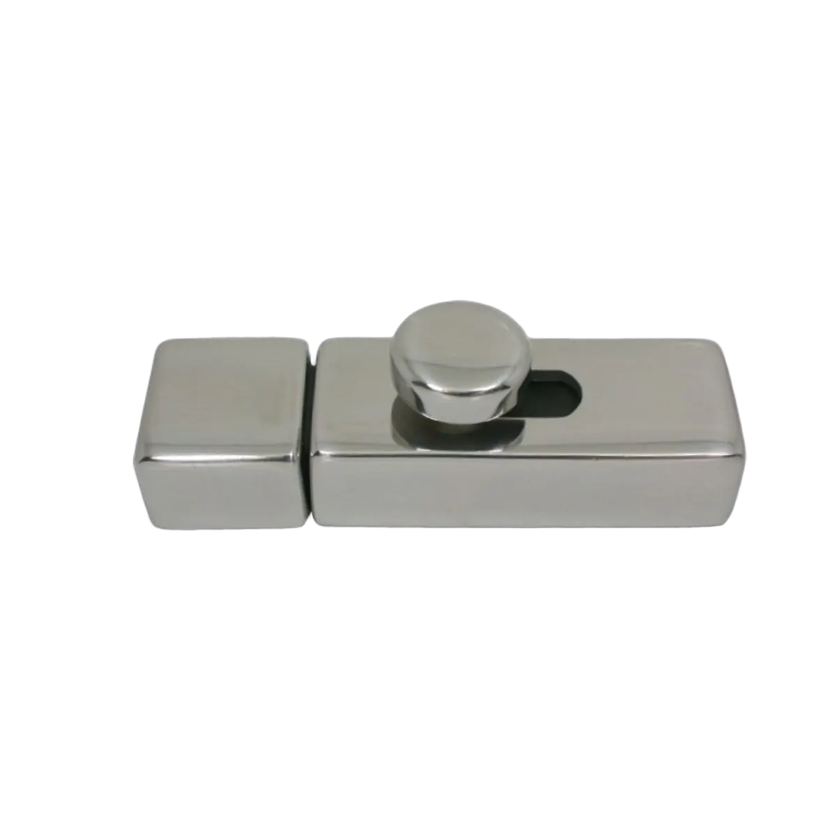 Spring self-closing, square line barrel bolt. Mirror polished cast 316 grade stainless steel body with concealed mount fastenings. Nylon slide for smooth action and no rattle.
