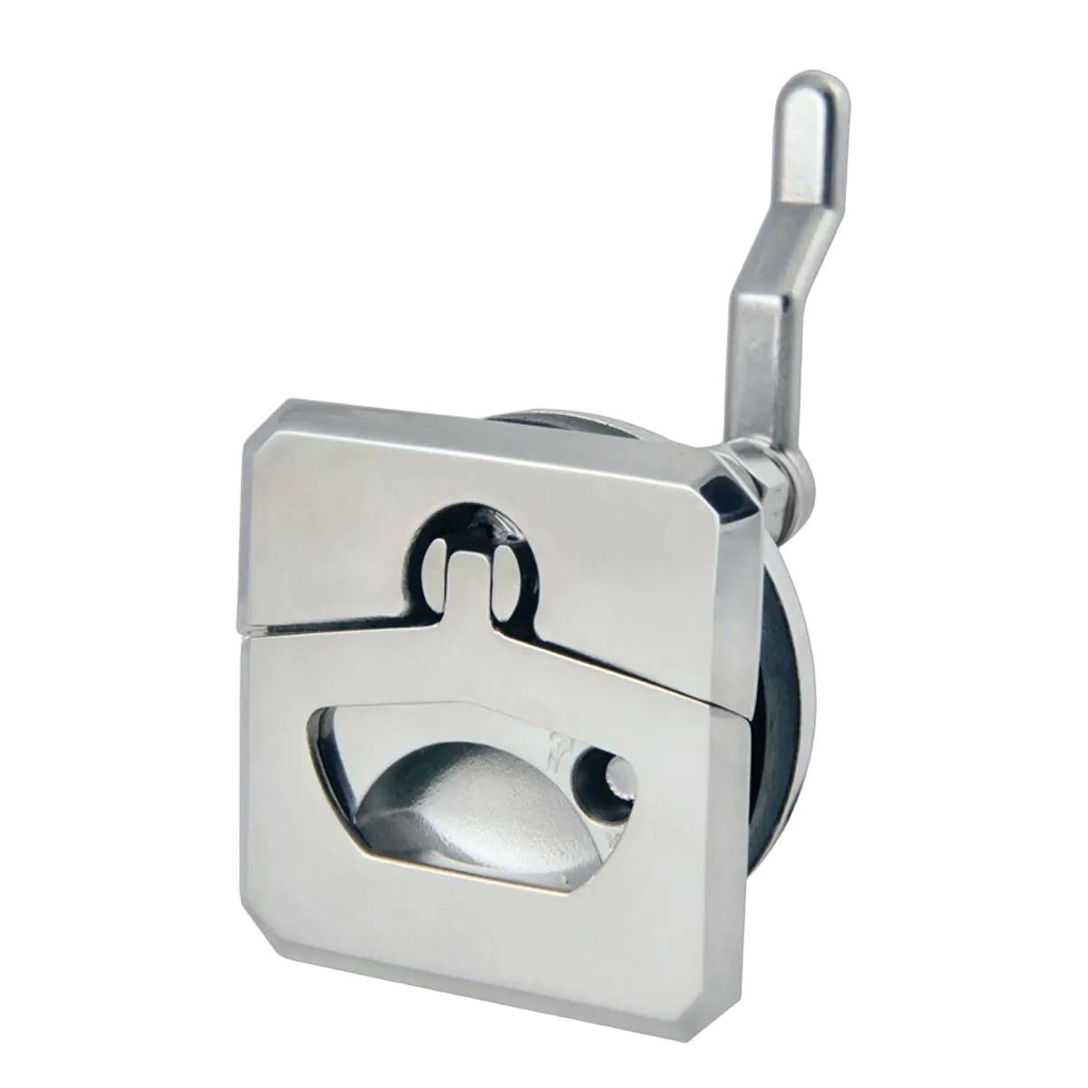Square stainless steel lift ring latch with optional key lock mechanism. Simple single hole installation. Latch is operated by rotating full handle lift ring 180°. Watertight, anti-rattle design.