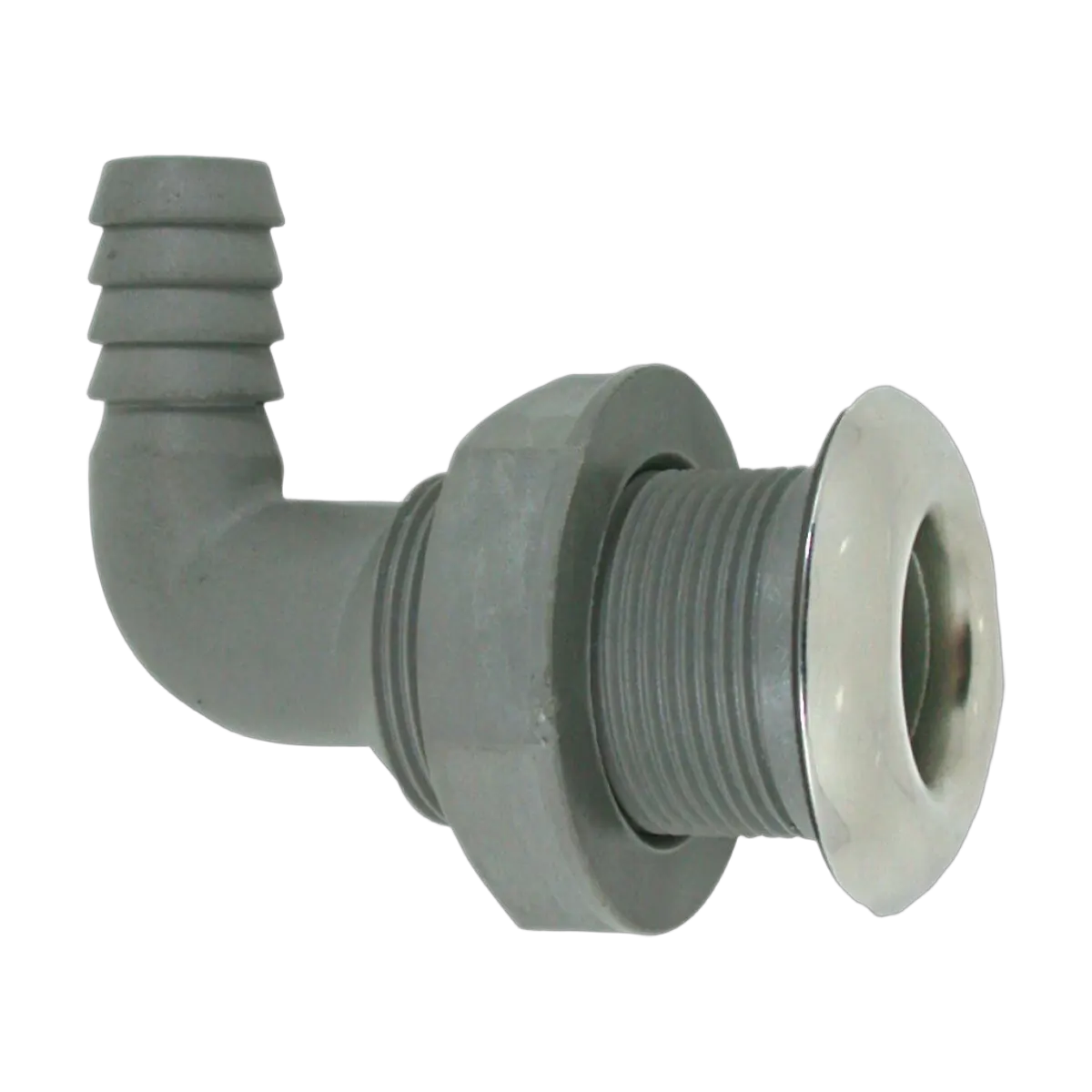 Nylon and stainless steel combined. Glass reinforced nylon with a 316 grade stainless steel stamped face. Combining the strength and lightweight of a reinforced nylon with the aesthetics of polished stainless steel. Suitable for above waterline outlets.