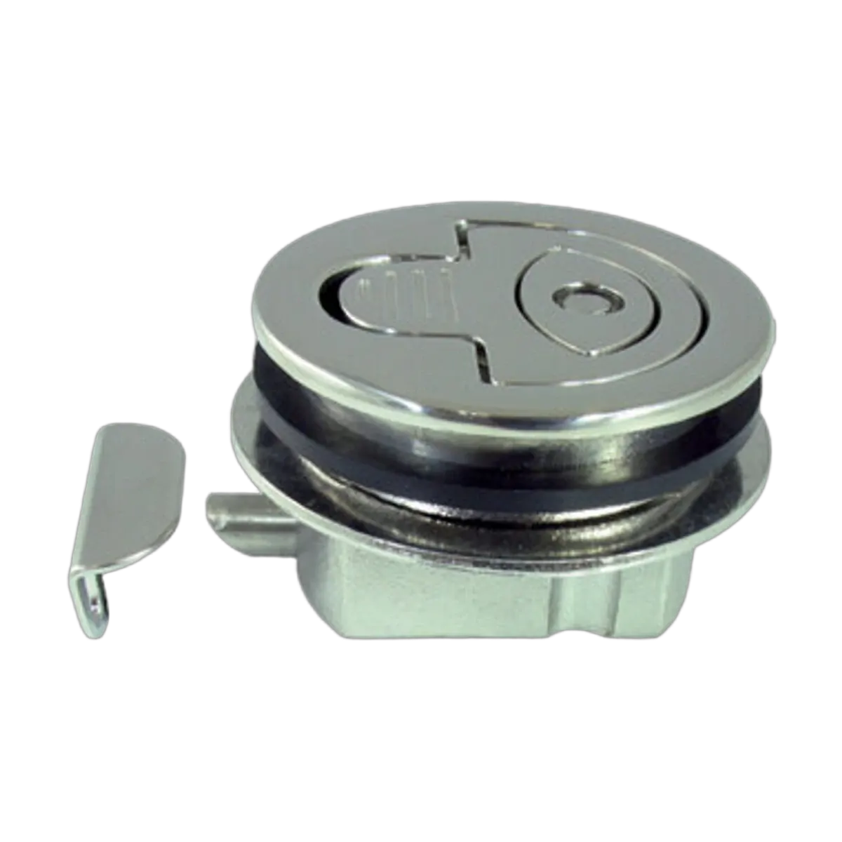 Marine Town Waterproof Flush Catches - Stainless Steel Catch Flush Pull C/W Lock Waterproof S/S 193213 Self closing flush top catch with only 3mm protrusion. The highly polished cast 316 grade stainless steel housing and waterproof non-rattle mechanism make this catch suitable for both interior and exterior installations. Operates by pushing down the finger tab to flip up the ring pull. Supplied with a variety of back spacer rings to ACcommodate varying material thickness.2712 Accessories193229 Spare key