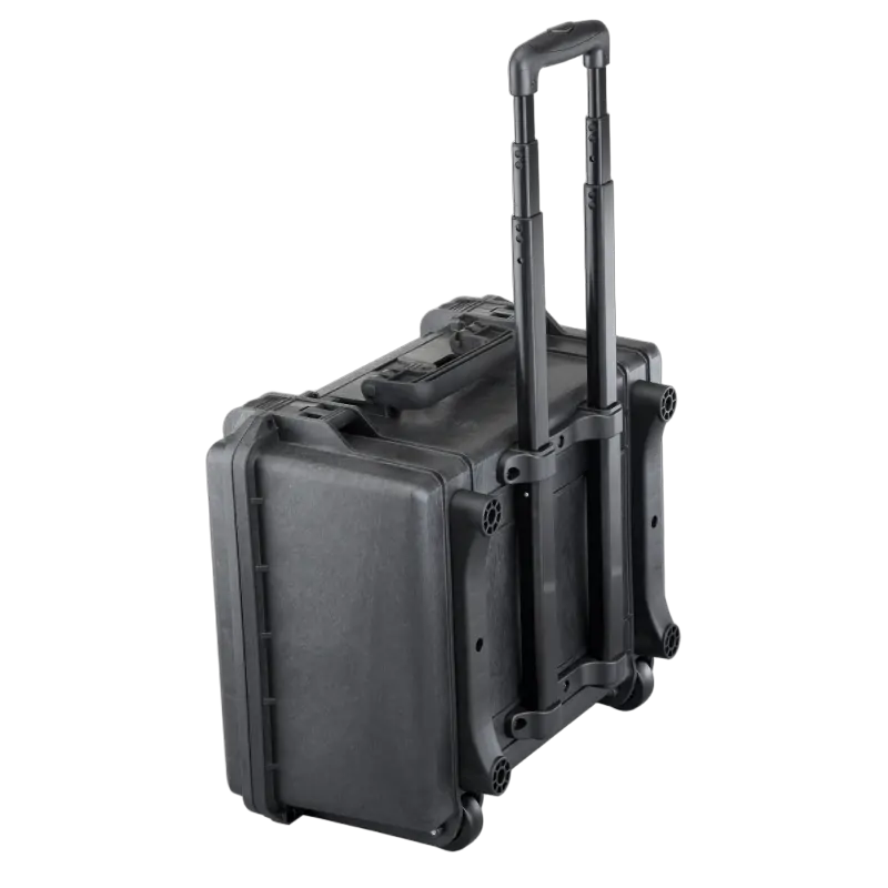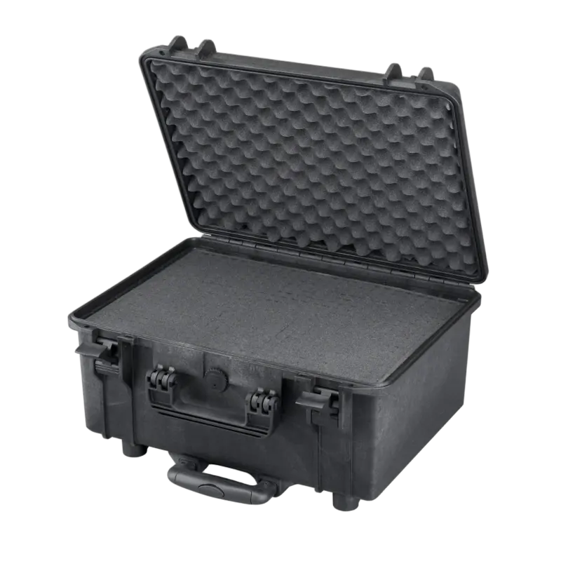 Watertight case on trolley and wheels to transport and protect fragile and valuable objects. Max Cases are created to offer superior protection from water, dust and impacts IP67, ATA300 and military certifications. Cubed foam included.