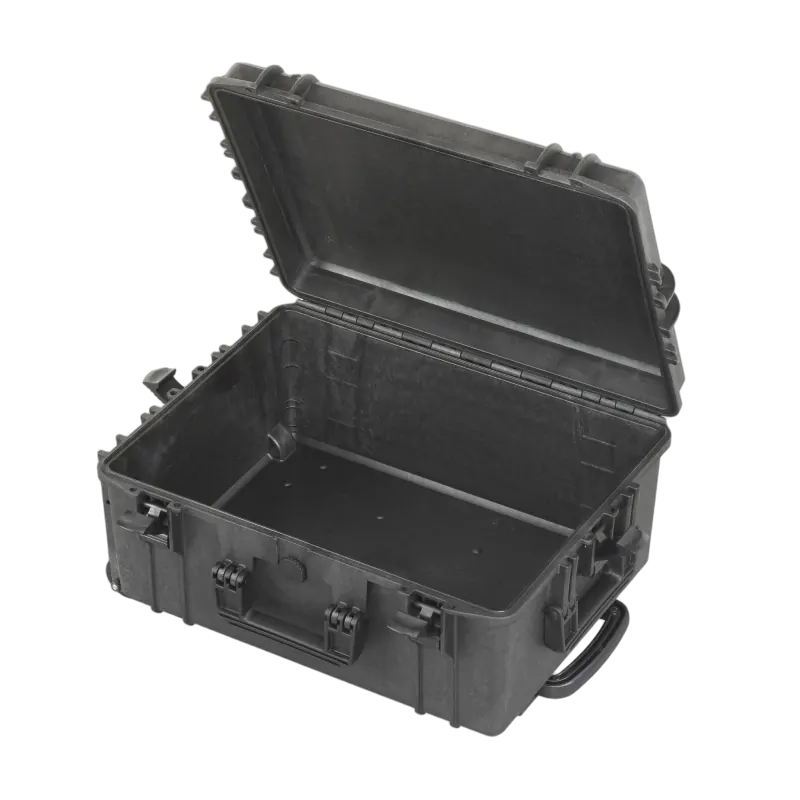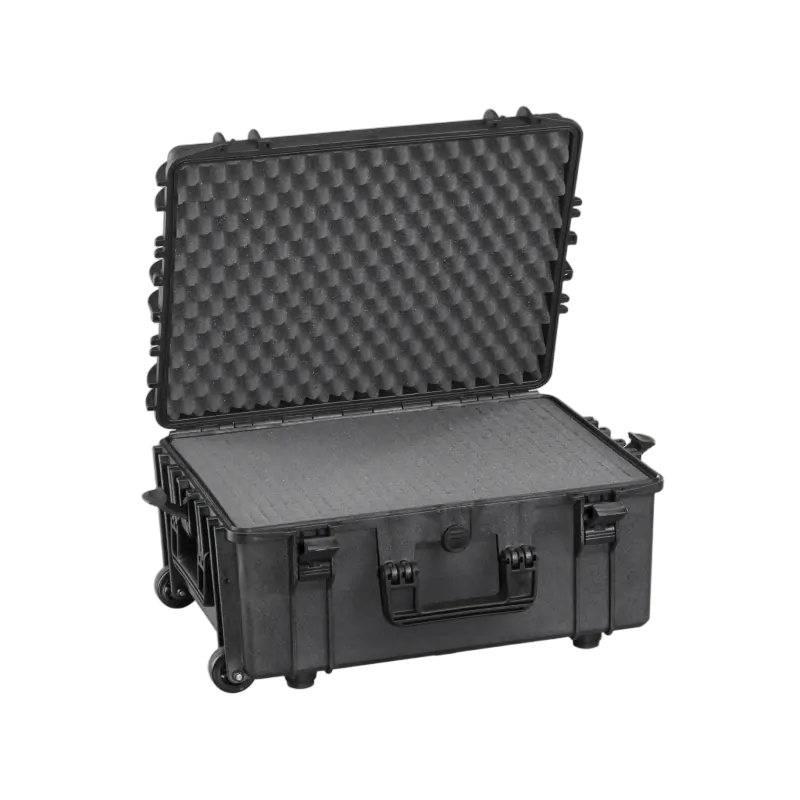 Watertight case on trolley and wheels to transport and protect fragile and valuable objects. Max Cases are created to offer superior protection from water, dust and impacts IP67, ATA300 and military certifications. Cubed foam included.