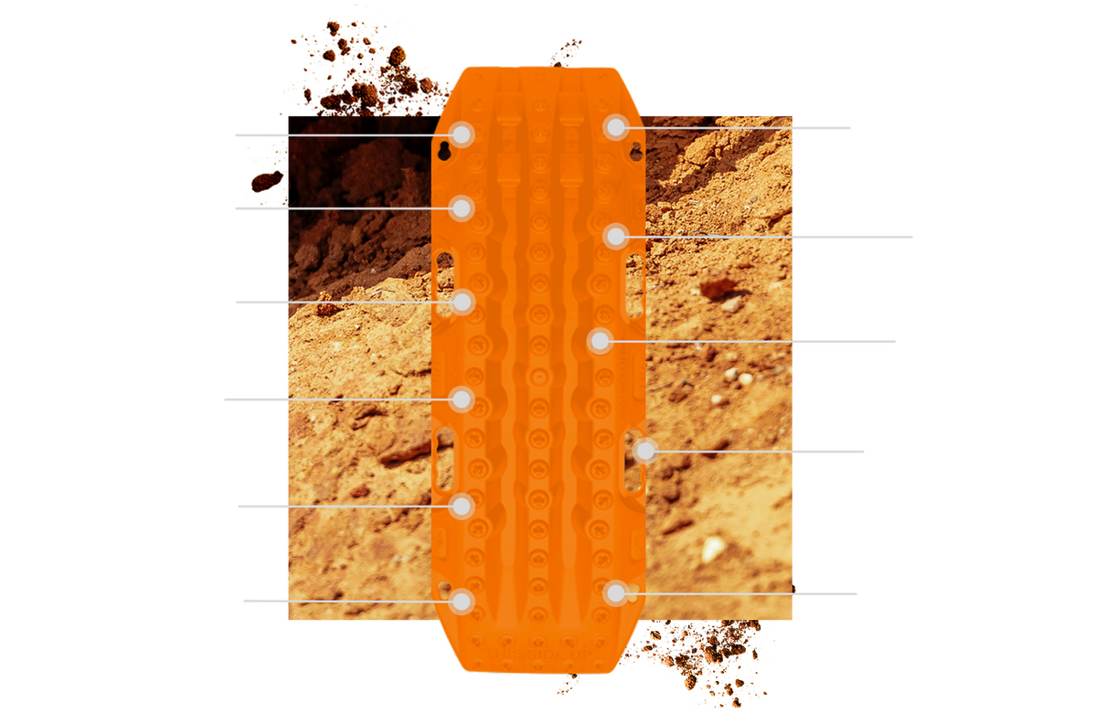 On the shorter MAXTRAX LITE recovery tracks, you'll find four comfortable handles for easy handling. Like all MAXTRAX boards, they stack together seamlessly with convenient mounting pin holes that double as linking points.