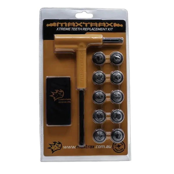 The MAXTRAX XTREME TEETH REPLACEMENT KIT includes 10 anodised alloy teeth to suit MAXTRAX X Series 4WD Recovery Tracks (not compatible with MAXTRAX MKII), plus a MAXTRAX XTRACT INSERT TOOL and a soft bag to store the replacement teeth. All of the teeth on the MAXTRAX X Series 4WD Recovery Tracks are the same shape and size, so you can replace any damaged tooth with any of these replacement teeth; a quick and easy task using MAXTRAX XTRACT INSERT TOOL.