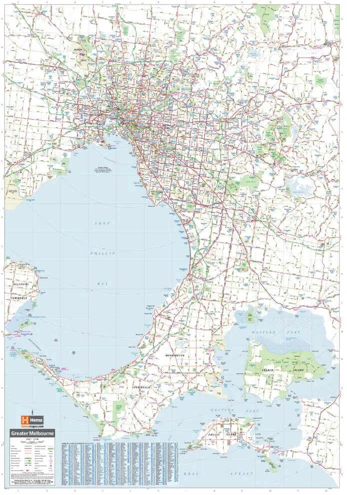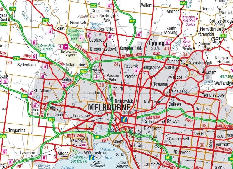 The Melbourne and Region map features a primary map of Greater Melbourne (1:115,000) that includes highways, major roads and local streets, as well as 24-hour fuel, parks and caravan parks. On the reverse is a Melbourne CBD map with accommodation, shopping and other places of interest pinpointed, along with train and tram network maps and a Melbourne Region map.
