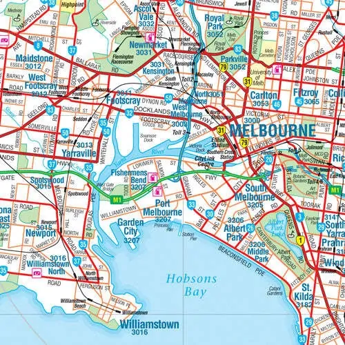A laminated map of Melbourne and the surrounding region that is ideal as a reference and for planning sales and delivery zones. The mapping features suburbs and postcodes, marked camping areas, caravan parks, fuel supplies, major national parks and an index. The map covers from Phillip Island in the south, to Werribee in the west, to Sunbury in the north and Pakenham in the east.