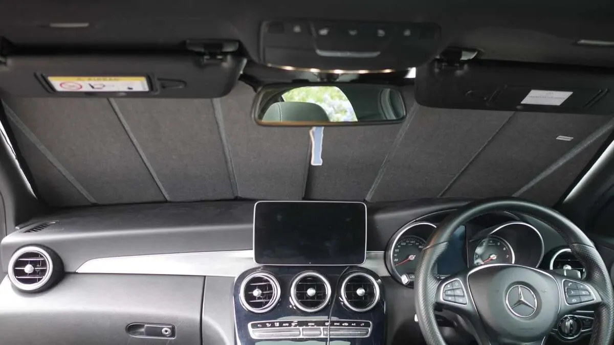 Note: Our custom sun shades block out a significant amount of light and UV rays that enter from the front windscreen, however due to the angle of the front windscreen and additional sensors or different mirror shapes/sizes available for different models, there may be slight gaps around your rear-view mirror or sides to allow the sun shade to fit.
