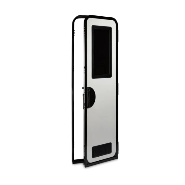 Columbia caravan doors have been designed and tested for your safety while travelling in your recreation vehicle. This is a left hand hinge door - it opens from the right with the hinge located on the left.