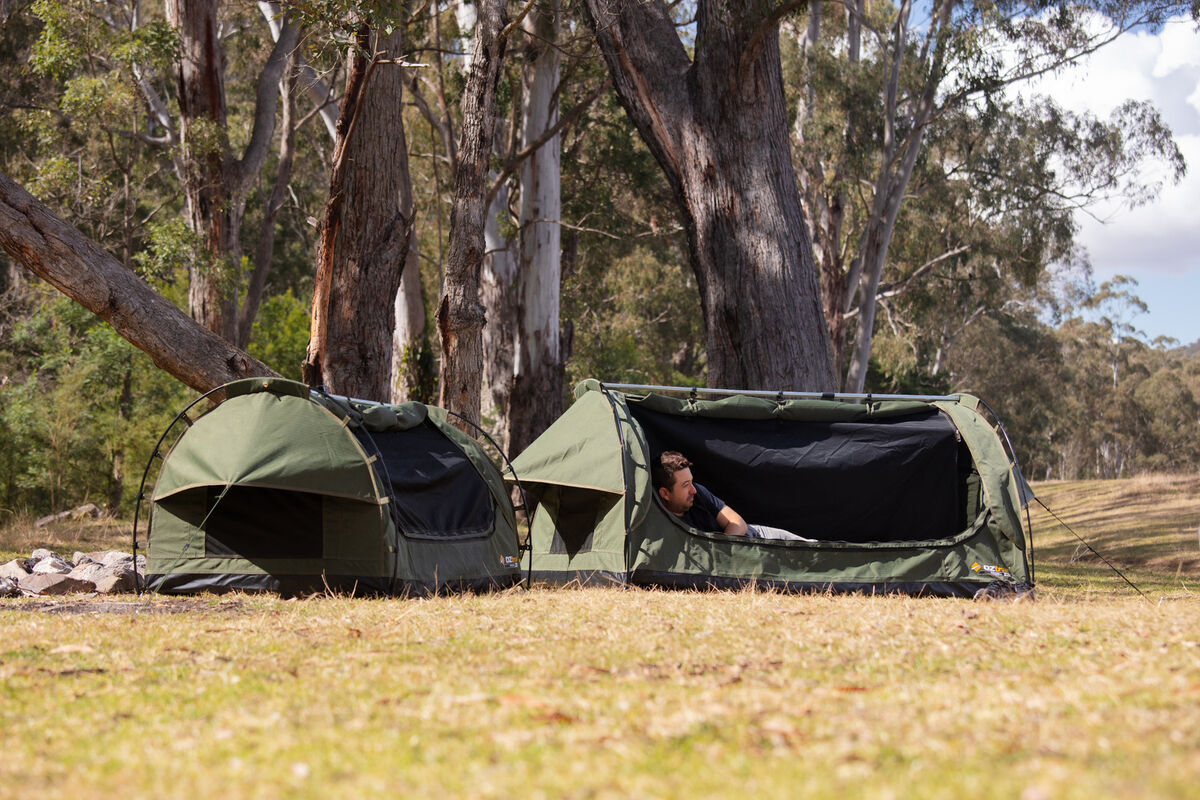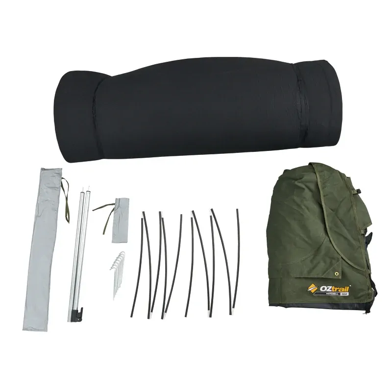 The Mitchell 1550 sleeps two people in comfort and provides a quick and easy to set up swag solution when hitting the road. This swag is constructed with a heavy duty, seam sealed 400GSM Ripsstop polycotton canvas material and a ultra-tough 440GSM PVC bucket floor to stand up to harsh terrain. Feauturing a free standing design for quick set up and extra internal space along with a comfortable 5cm high density foam mattress to give you a comfortable nights sleep. There's plenty of ventilation throughout thanks to the zippered head and foot windows, along with the full sized mesh door on the sides for great cross airflow. There are multiple storage pockets throughout for improved internal organisiton, perfect for phones, wallets, keys and even a midnight snack. The integrated compression straps makes pack down a breeze, and ensures a compact pack size when hitting the road.
