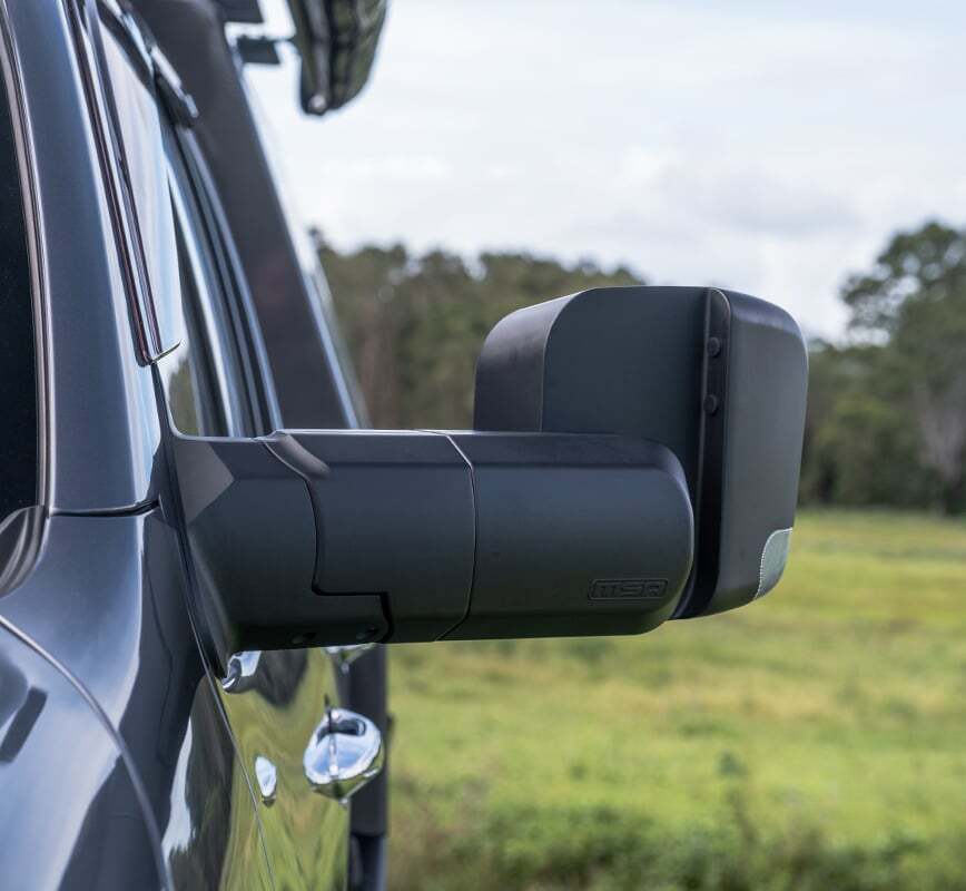 The large single mirror lens creates less confusion and enhanced safety while driving. The four, easily adjustable positions, provide greater vision, with less vibration to any towing situation, while maintaining ADR compliance and safety. When the mirror is rotated into the horizontal position, the mirror’s actuator automatically adapts, allowing for standard adjustments (up, down, side to side) from the vehicle’s standard mirror controller. This caters to drivers of differing height and seated positions. Designed to fold inwards or outwards when bumped in car parks, or when contact is made with trees and other obstacles around the vehicle. Simple to fit. MSA 4X4’s Towing Mirrors mount onto a vehicle door in the same position as the existing mirrors. Most factory mirror functions are retained and come with the choice of black or chrome.The MSA 4X4 patented Towing Mirrors are manufactured extremely tough.Injection moulded and die cast aluminium components deliver a high-quality towing mirror to withstand Australian conditions. A great all-around mirror for towing caravans, camper trailers, trailers, boats and horse floats. Available to suit a growing range of towing vehicles.