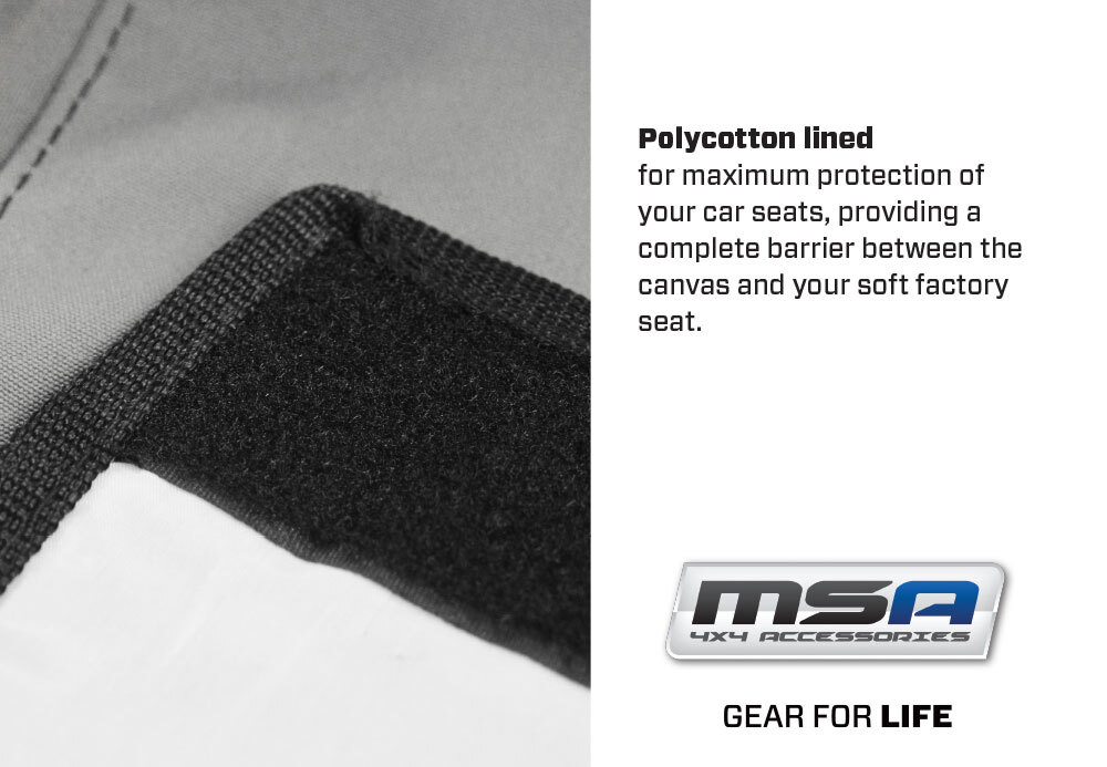 - Polycotton lined for maximum protection of your car seats, providing a complete barrier between the canvas and your soft factory seat