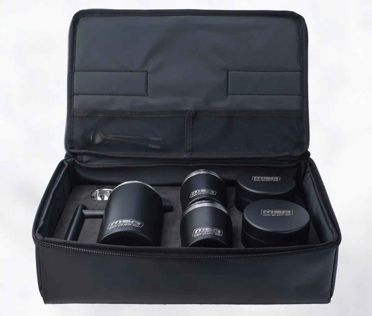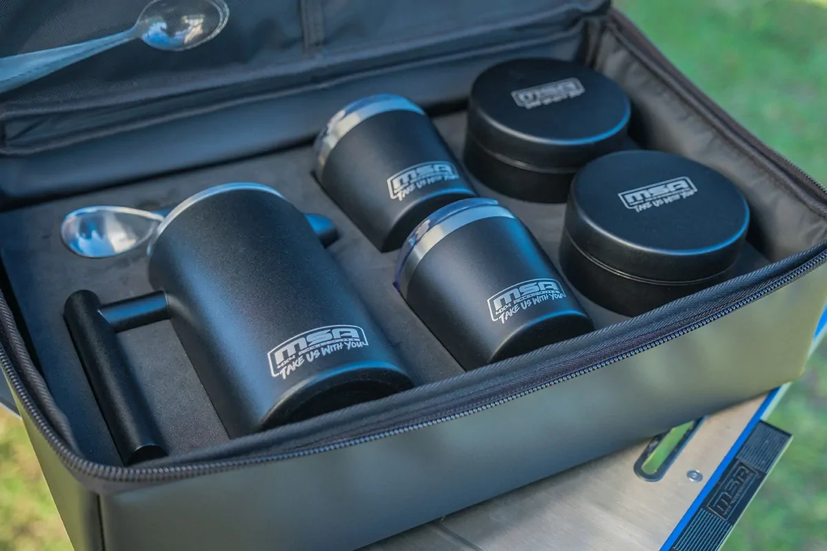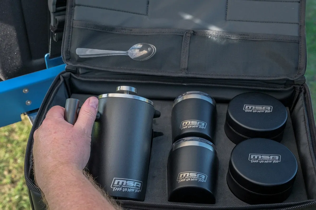 1 x 600ml Thermo Coffee Plunger 2 x 240ml Thermo Cups with clear lid. Made from powder coated, stainless steel, with double-wall insulation 2 x 500ml Storage Canisters for coffee, sugar or creamer 1 x 30ml Coffee Measuring Spoon 2 x MSA 4X4 Branded Teaspoons Mirco Fibre Cleaning Cloth STORAGE BAG