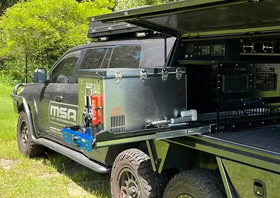 This is the only powered slide that extends beyond the vehicle as it lowers, allowing for better fridge access; this is extremely important in wagons and utes. The MSA Power Slide™ is the best-looking powered slide on the market.