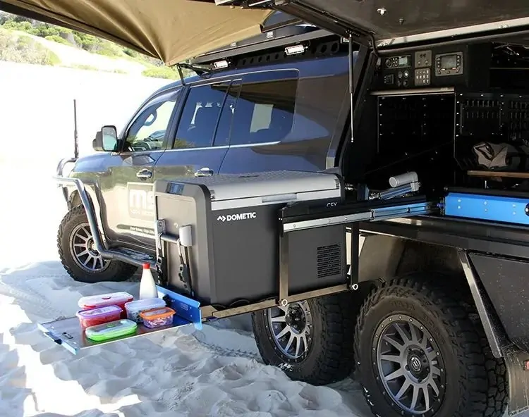 This is the only powered slide that extends beyond the vehicle as it lowers, allowing for better fridge access; this is extremely important in wagons and utes. The MSA Power Slide™ is the best-looking powered slide on the market.
