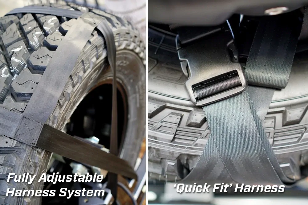 - Fully adjustable harness system that fits any tyre size