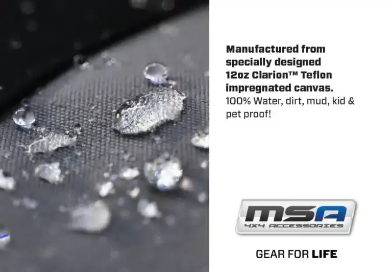 The service life of MSA 4X4 Canvas products will be long and trouble free by following these simple care instructions. The canvas used in the manufacture of MSA 4X4 Accessories canvas products are of a premium blend of polyester and cotton. Cotton for a natural feel and polyester for strength and longevity.BRUSH loose dirt off with a soft brush.WIPE with a microfibre cloth or sponge and warm water in a circular motion.REMOVE excess water with chamois then allow to dry naturally.REMOVE deposits of organic matter such as soil, grass or bird droppings from the canvas as soon as convenient.DO NOT apply soaps, detergents, bleaches, cleaning fluids or insecticides to the canvas as these will remove the waterproofing and will affect the dye.DO NOT machine wash. (never machine wash any good quality canvas as it will destroy its waterproofing treatment).DO NOT allow petrol, diesel, oil, kerosene or other similar fluids to come into contact with the canvas.DO NOT scrub the canvas as excessive scrubbing will also remove the waterproofing treatment.