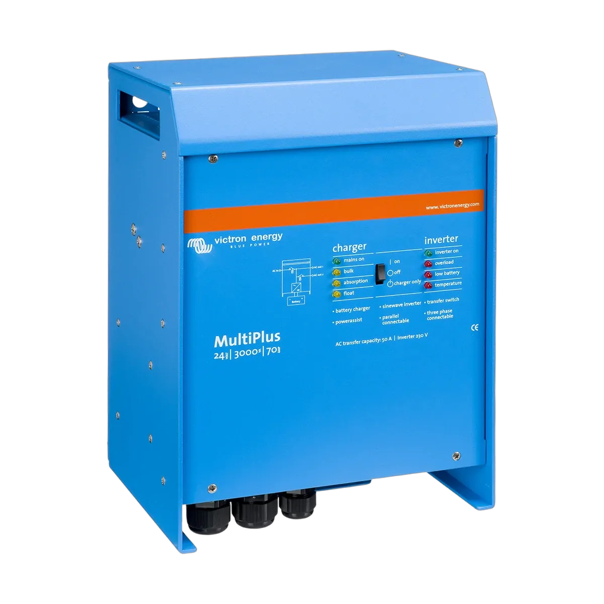 Virtually unlimited power thanks to parallel operation- Up to 6 Multis can operate in parallel to achieve higher power output. Six 24/5000/120 units, for example, will provide 25 kW / 30 kVA output power with 720 Amps charging capacity.