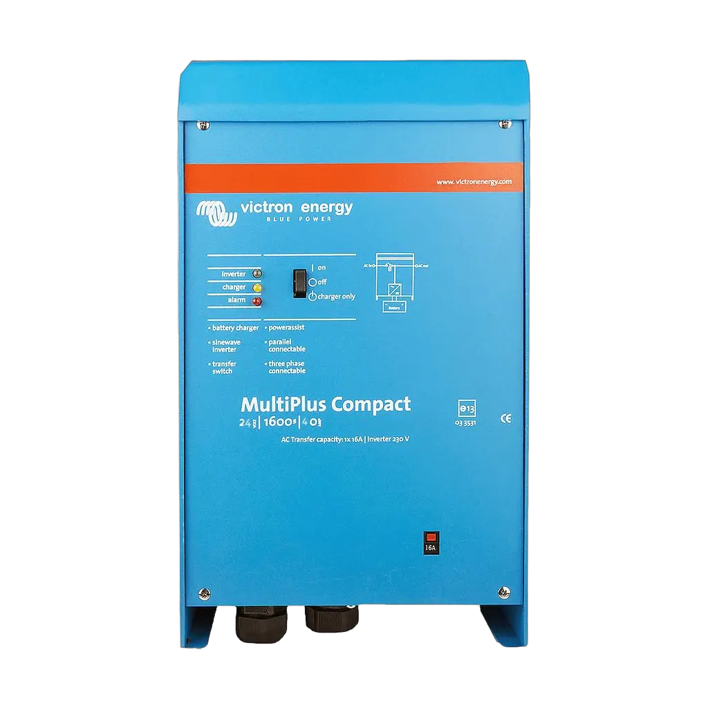 The MultiPlus, as the name suggests, is a combined inverter and charger in one elegant package. Its many features include a true sine wave inverter, adaptive charging, hybrid PowerAssist technology, plus multiple system integration features. The MultiPlus will prevent overload of a limited AC source, such as a generator or shore power connection. First, battery charging will automatically be reduced when otherwise an overload would occur. The second level will boost the output of a generator or shore side supply with power taken from the battery.