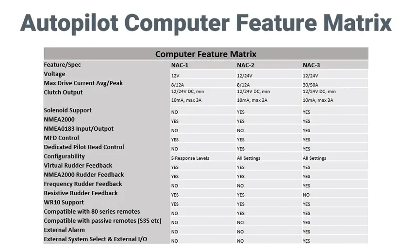 The low-current NAC-2 autopilot computer is ideal for smaller vessels, designed to run small hydraulic drives and mechanical drives for vessels up to 10 metres (33 feet) in length. Also provides solenoid output.