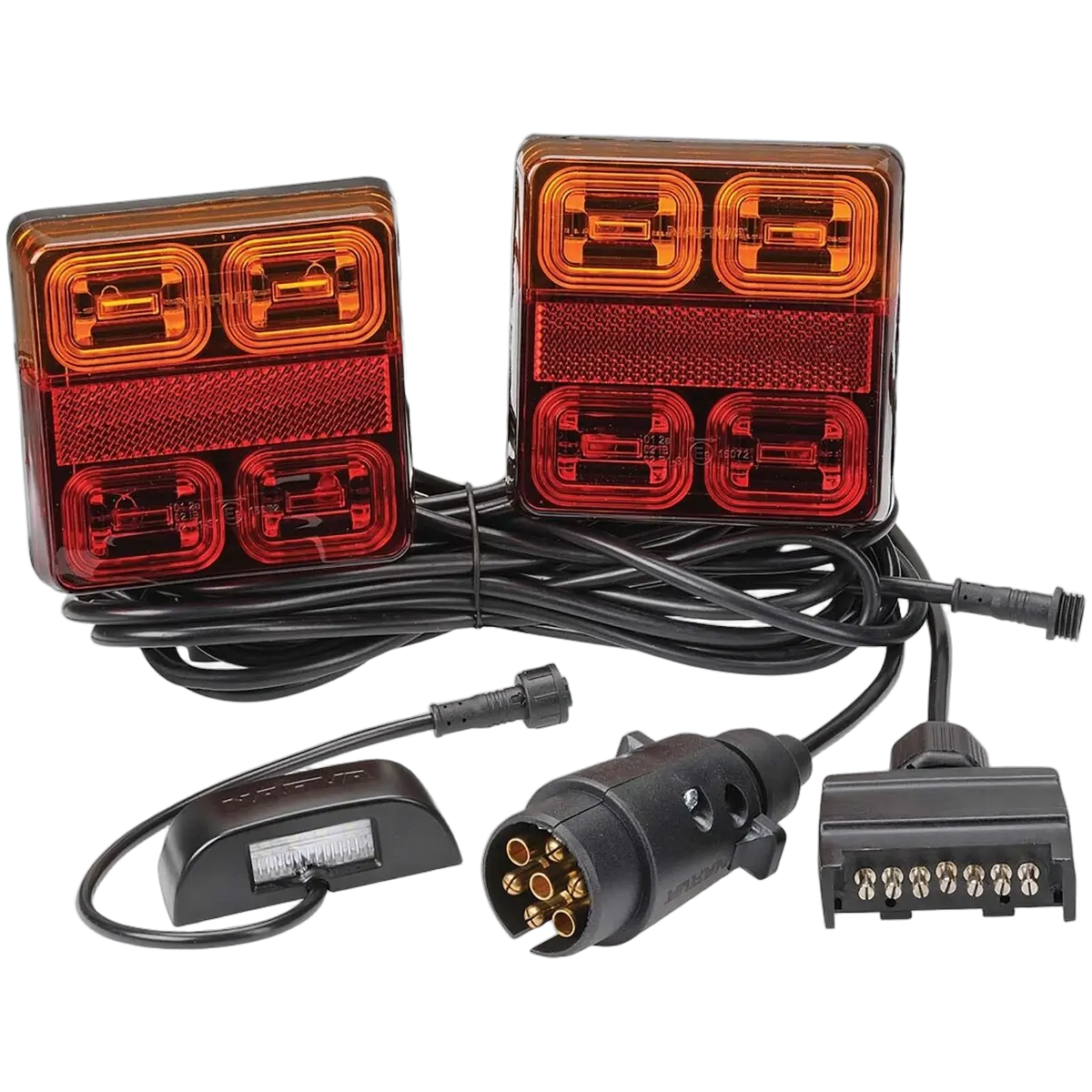 COMPRISES 2 x 12V L.E.D Slimline Rear Stop Tail, Direction Indicator Lamp with In-Built Retro Reflector, 0.5m Lead and Waterproof Connector; 1 x 12V L.E.D Slimline Licence Plate Lamp with 0.25m Lead and Waterproof Connector; 1 x 7 Pin Flat Trailer Plug with 1m Lead and Waterproof Connector; 1 x 7 Pin Large Round Trailer Plug with 1m Lead and Waterproof Connector; 1 x 'Plug and Play' Box Trailer Harness with Waterproof Connectors;