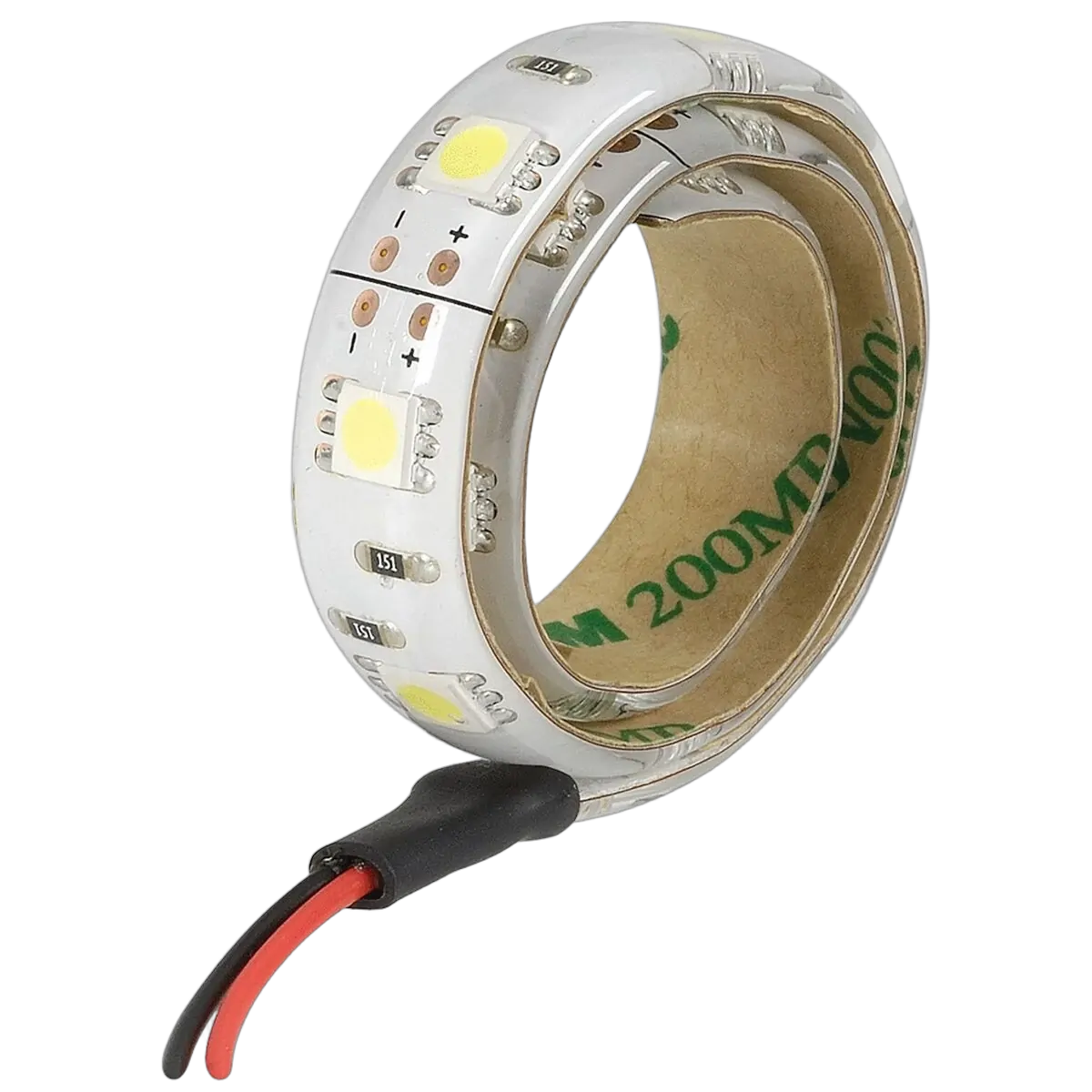 Flexible L.E.D tape provides a soft, cool white ambient light ideal for background illumination. Ideal for boat footwells, caravan cabinets, under benches etc. Self adhesive with strong 3MTM backing tape