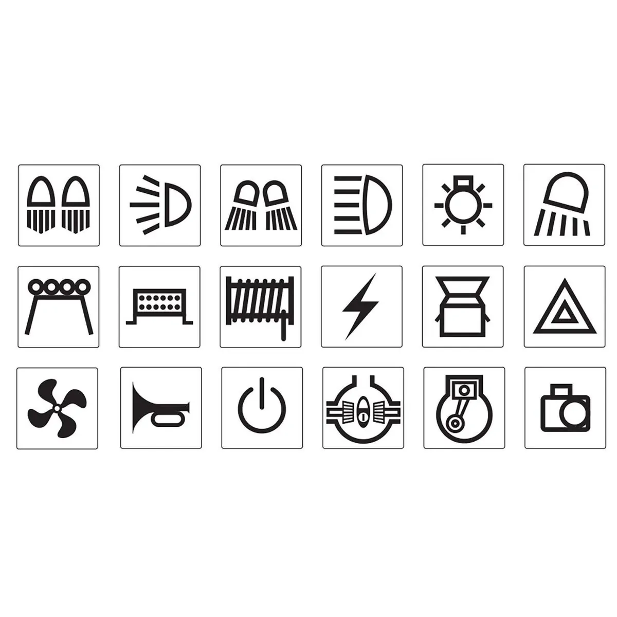 COMPRISES Includes symbols (pictured) & descriptions: off-road lights, backup lights, driving lights,; work lights, fog lights, spot lights, rock lights, aux lights, map light, roof lights, LED light bar,; Aux 1, 2 & 3, air compressor, 12V, fridge, front & rear diff lock, reverse camera, start, fan, winch, power, radio, horn, hazard warning;
