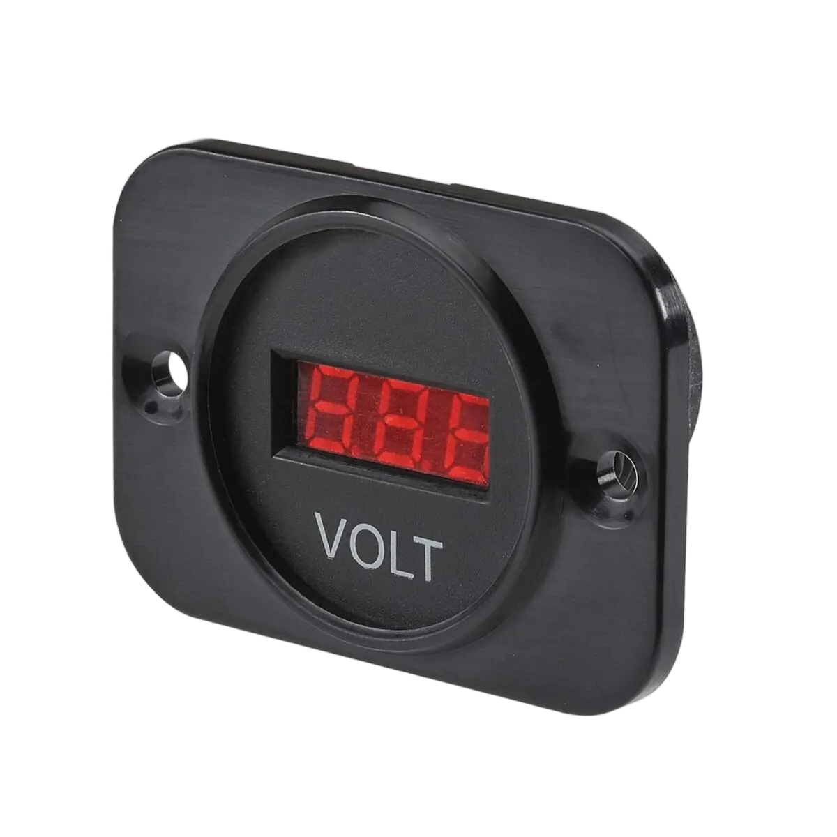 Easy to read L.E.D Volt meter displays accurate battery voltage level for quick reference. Can be installed with or without the mounting panel. Volt Meter Range: 6–33V DC Mounting opening 29mm dia.