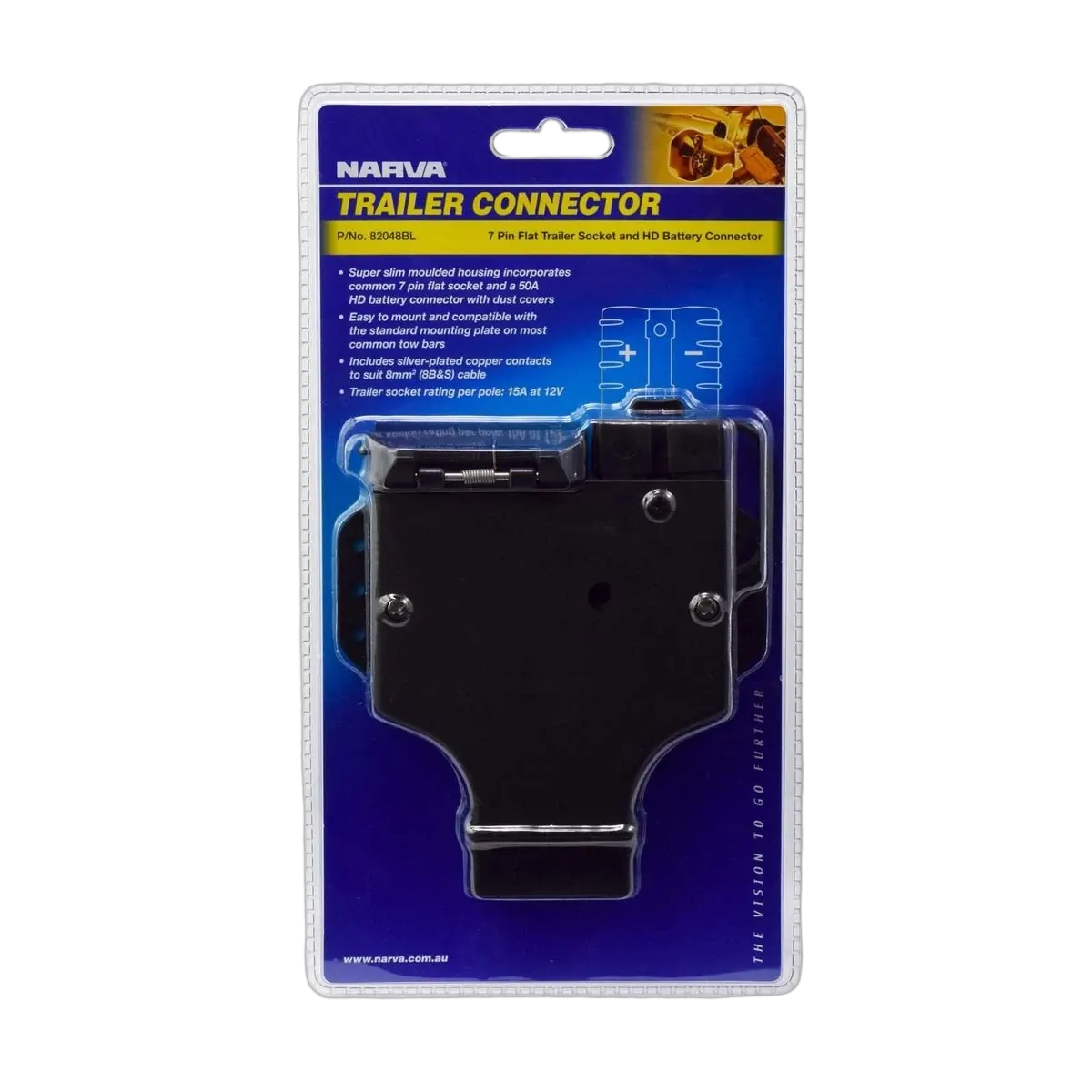 Built with the camping and caravan enthusiast in mind, this product is equally suitable for anyone that frequently tows vehicles requiring battery maintenance to the trailer, caravan battery or power for equipment operation. The 7-pin trailer plug delivers power to operate the standard stop, tail, reverse, indicator and licence plate light, whilst the built in HD battery connector delivers up to 50A of power to the battery to charge, maintain or power equipment like a fridge for long journeys.