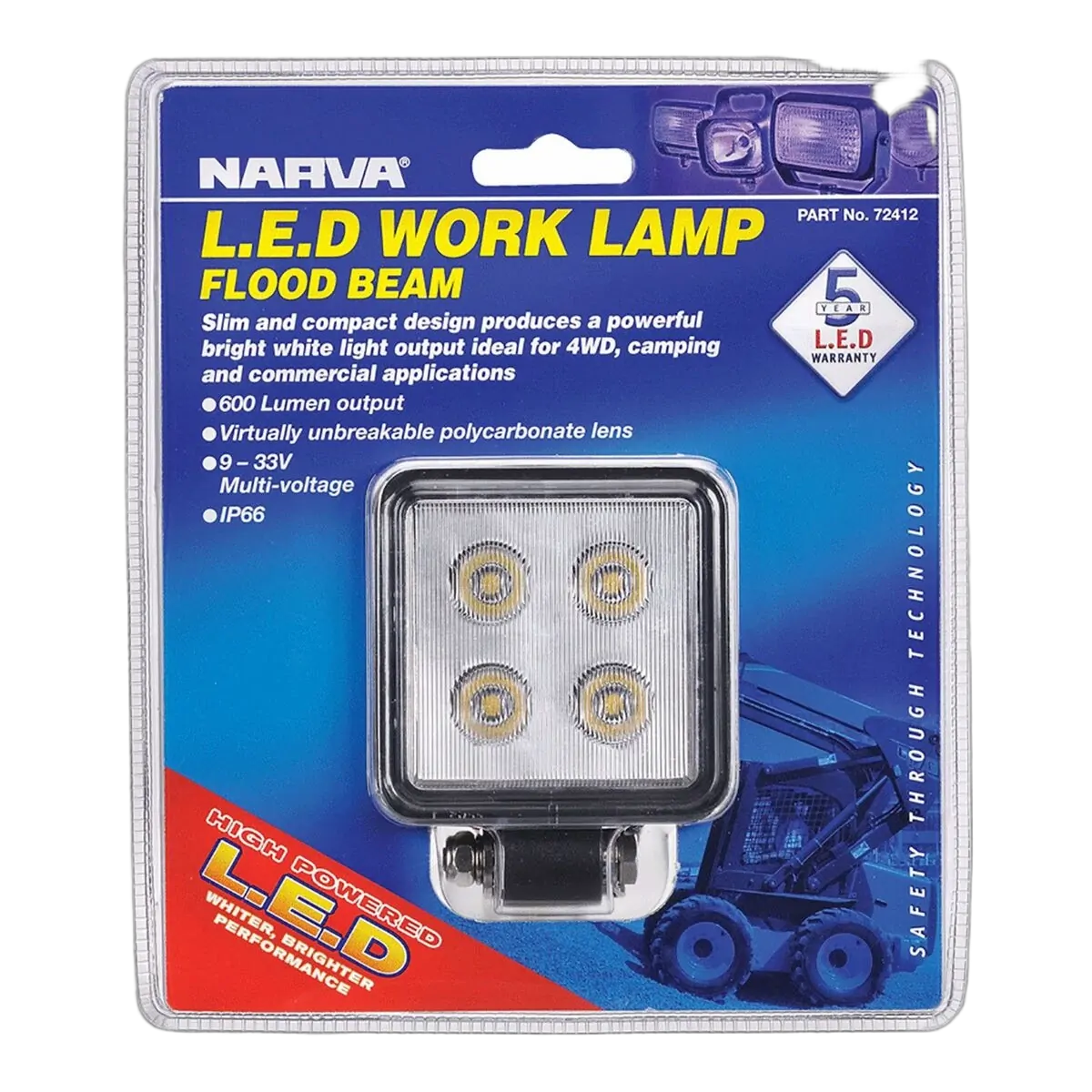 Features: A powerful 4 x 1W slim and compact L.E.D work lamp measuring just 70mm square, ideal for close range illumination and fitment to vehicles with limited space. Fully Sealed (IP66) with a pre-wired, die-cast powder coated aluminium housing.