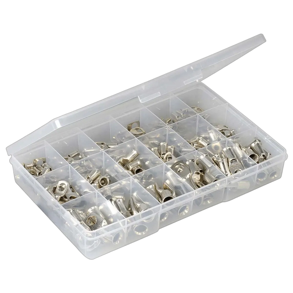 Contains 165 Narva cable lugs ranging from 10mm2 - 70mm2. Packed in a quality plastic case with an identification chart for easy re-ordering.