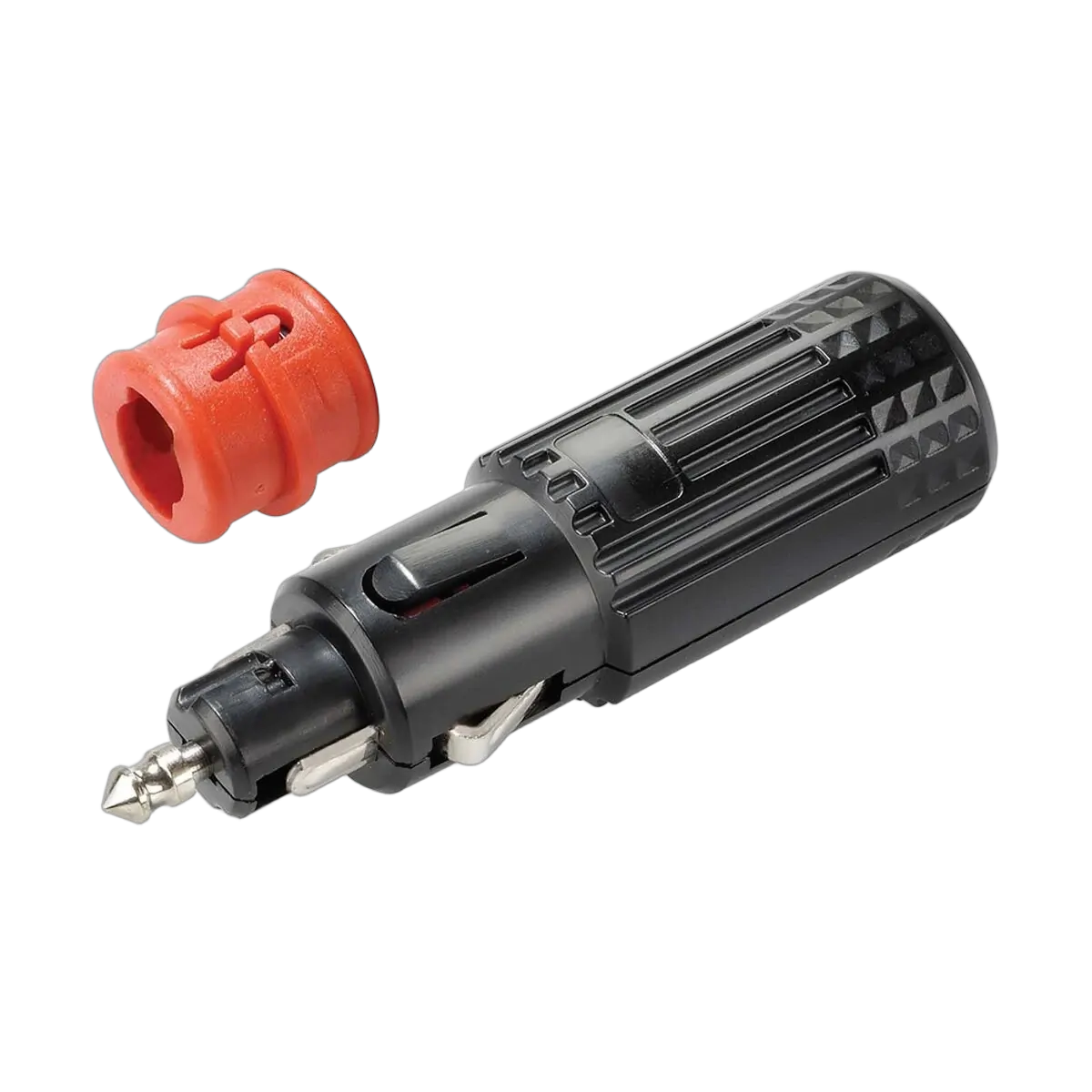 Fits all standard accessory sockets, and Merit sockets when the red tip is removed. Features L.E.D power on indicator and fuse protection. Amperage rating 15A at 12V, 8A at 24V