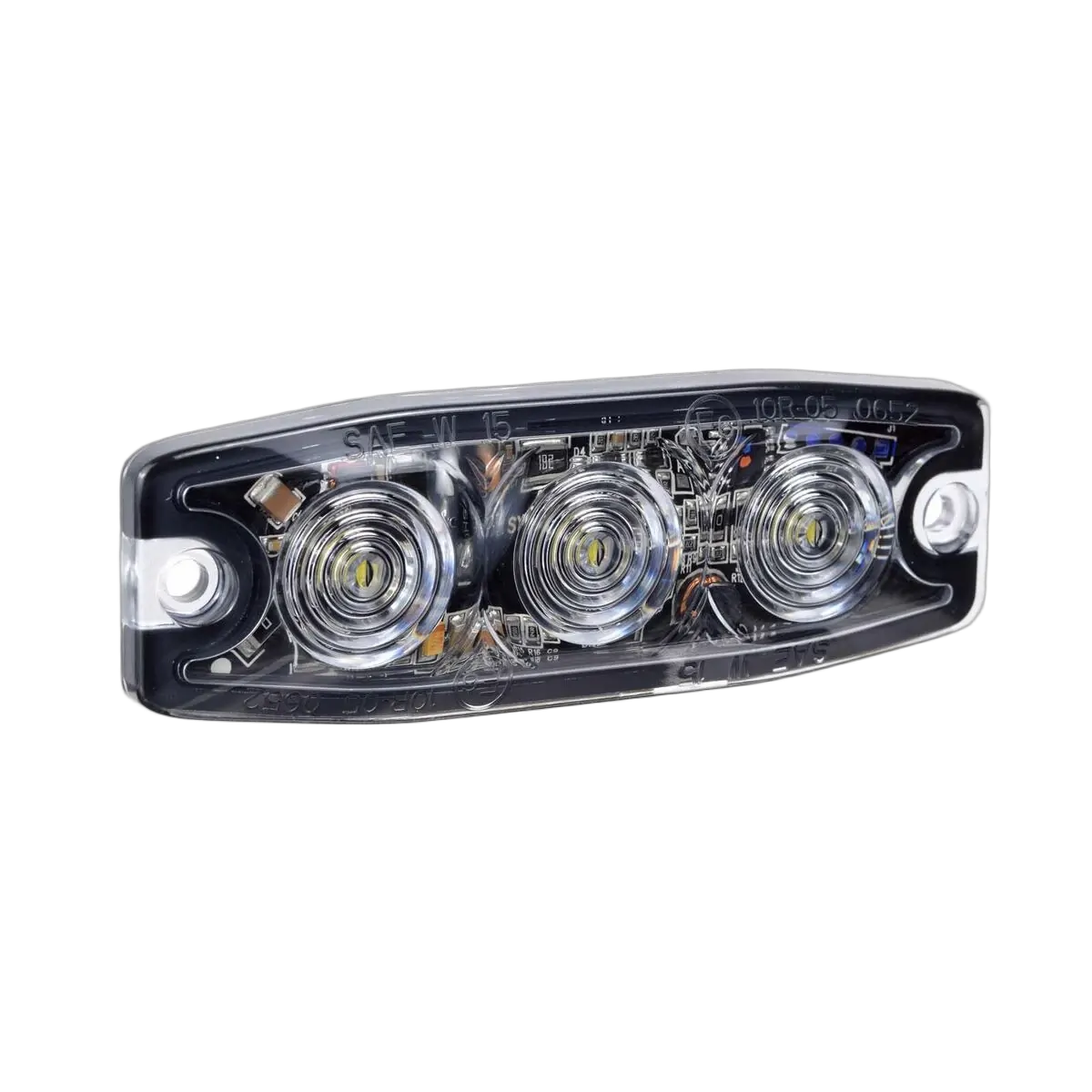 Features: Ultra low-profile slimline design utilising three high powered 1W L.E.Ds. 23 selectable flash patterns can be alternating or synchronised with multiple units and a nonvolatile memory retains last setting. Auto-dim function makes the lamps suitable for night operation. Supplied with 200mm,of pre-wired cables, 3M® tape or screws for fixing options.