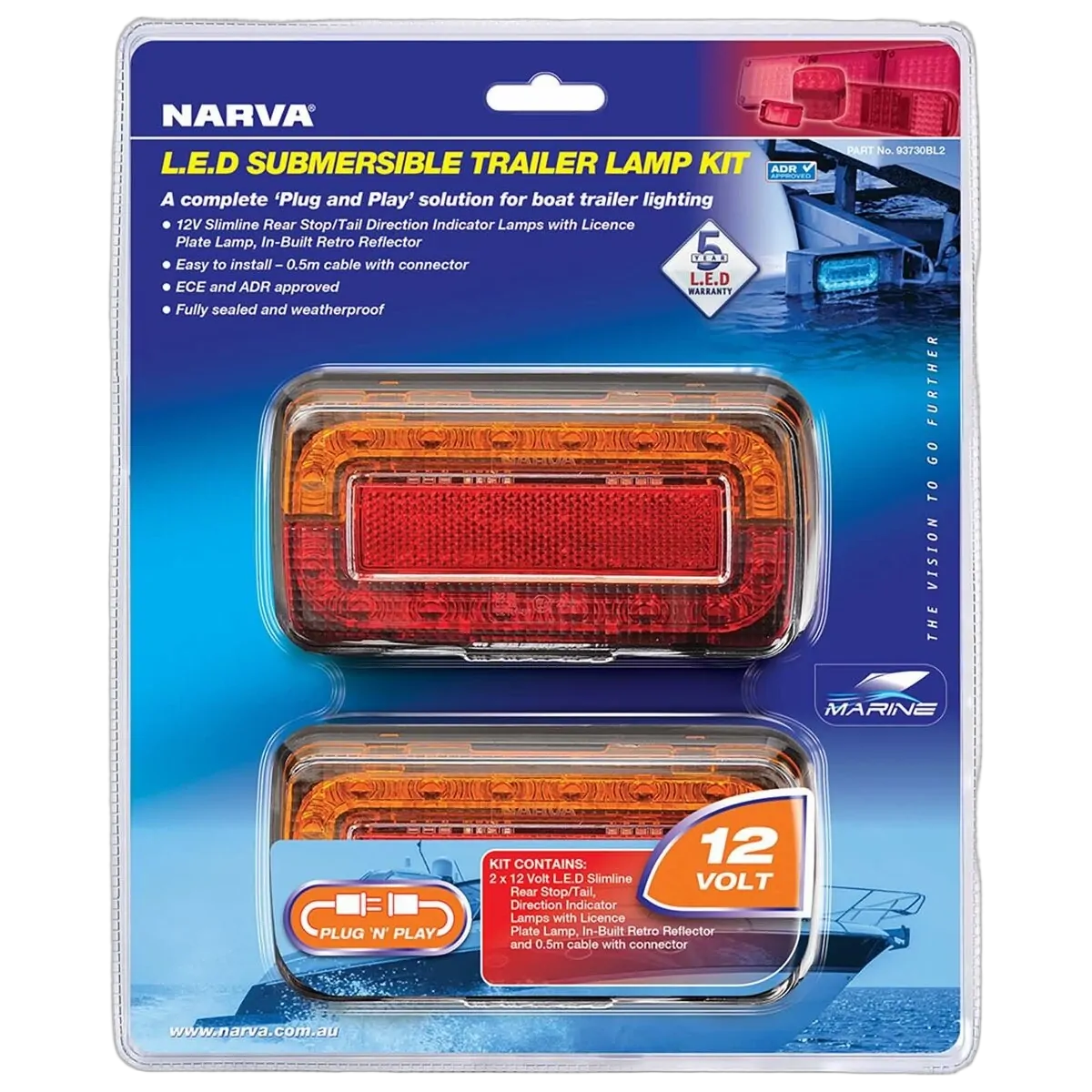 COMPRISES 1x 12V L.E.D slimline rear stop/tail, direction indicator lamp with in-built retro reflector, 0.5m lead and waterproof connector (93730); 1x 12V L.E.D slimline rear stop/tail, direction indicator with licence plate lamp and in-built retro reflector, 0.5m lead and waterproof connector (93734);