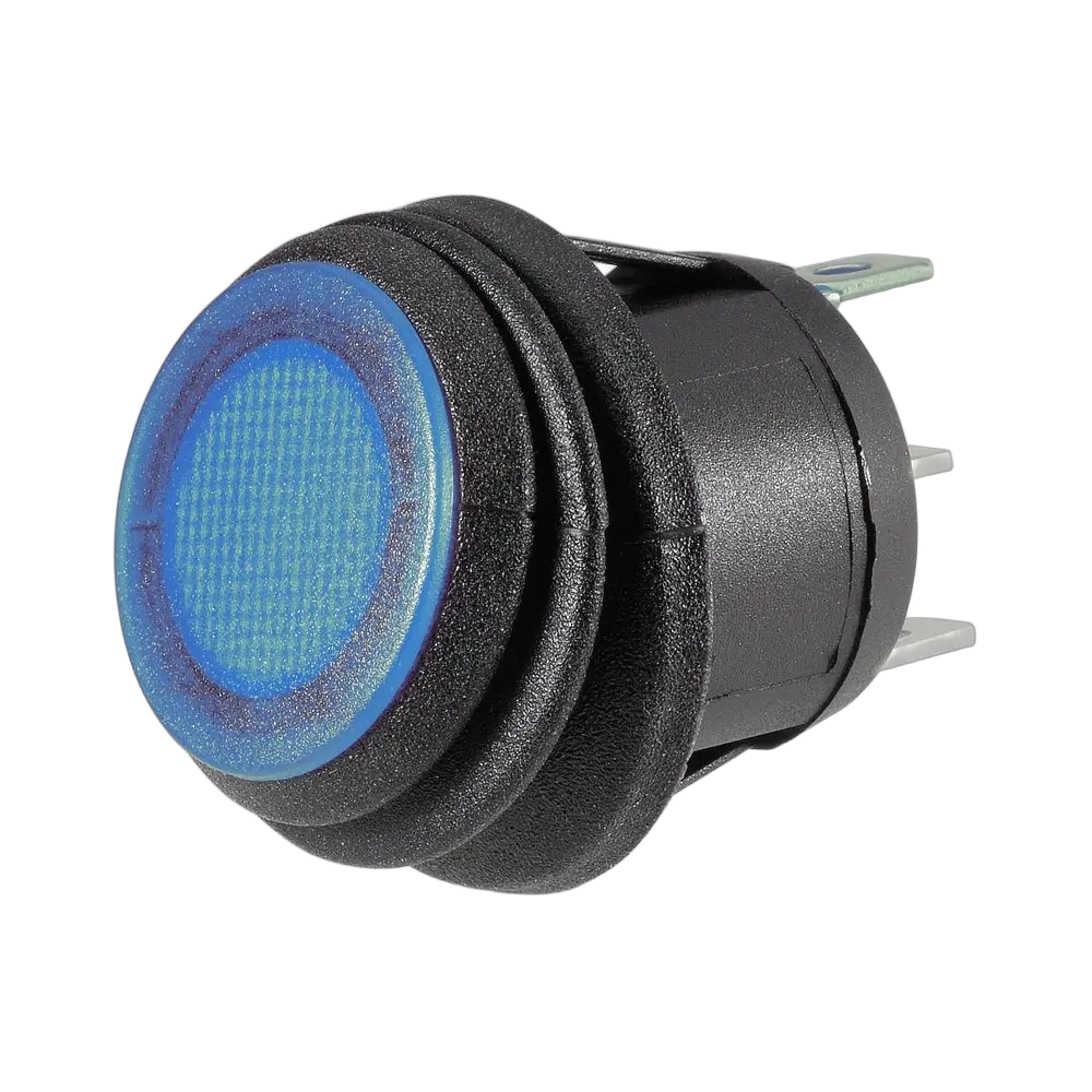 SPST, IP65 rated, push-fit design with push on terminals Amperage rating 20A for use at 12V only Mounting opening 20mm dia.