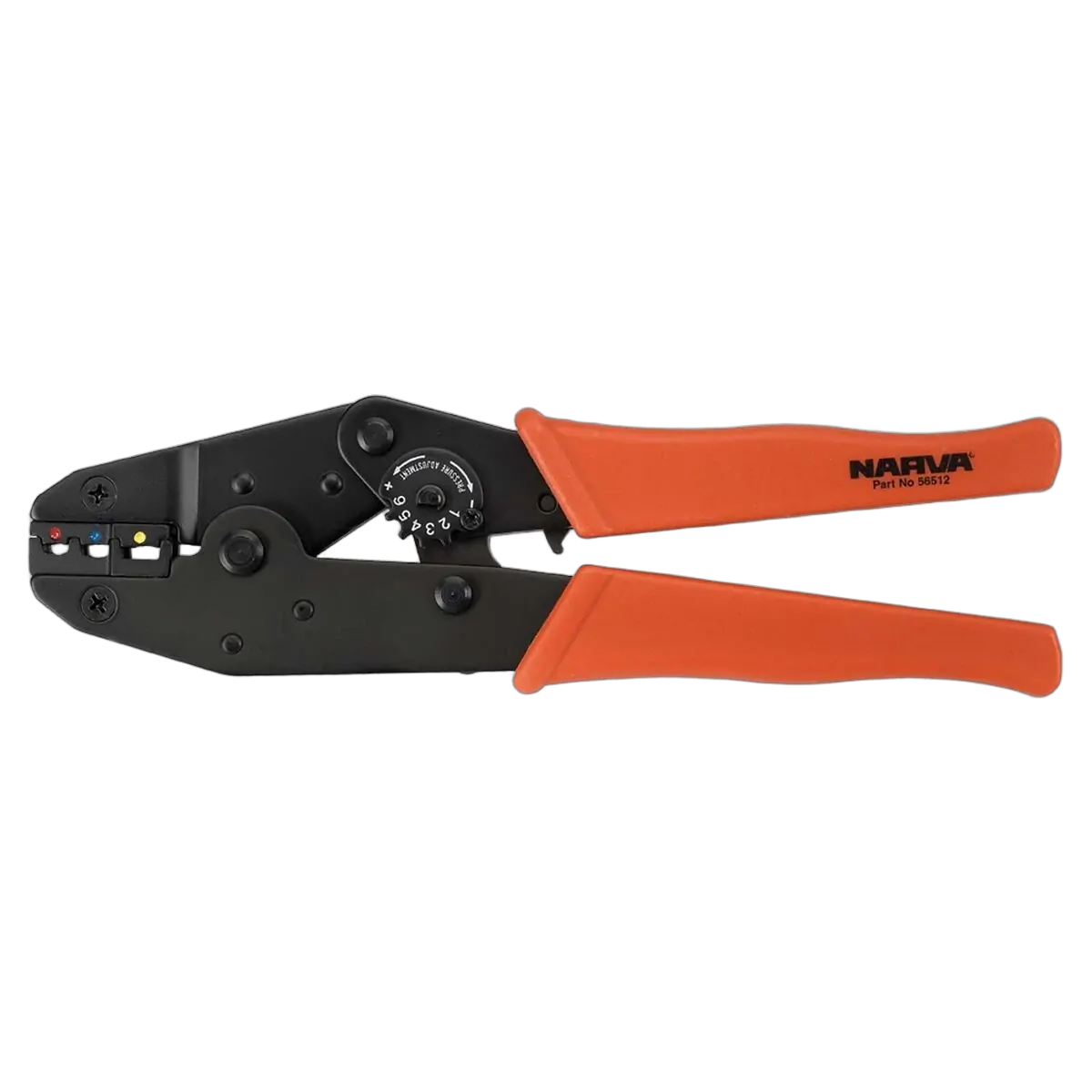 A heavy-duty ratchet tool with spring release, pressure adjustment and six settings. Suitable for red, blue and yellow insulated terminals.