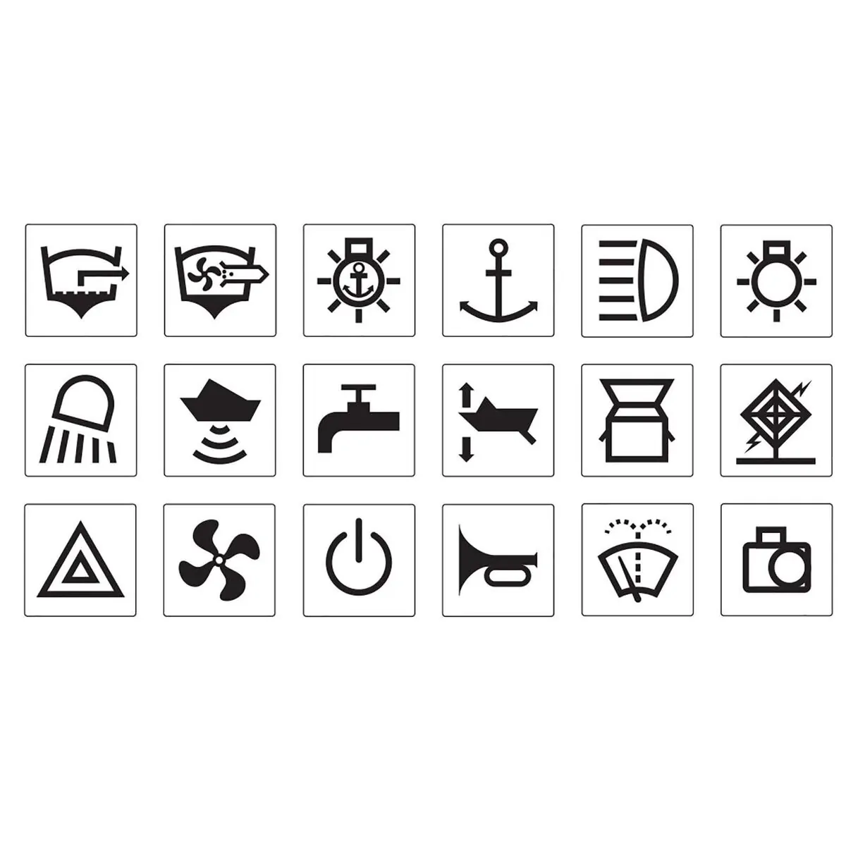 COMPRISES Includes symbols (pictured) & descriptions: anchor lights, bilge pump, bilge blower,; flood lights, courtesy lights, search lights, deck lights, spot lights, cabin lights, trim tabs, GPS, Aux 1, 2 & 3,; Acc, UHF, VHF, fridge, fresh water, reverse camera, wiper, wiper washer, fan, 12V, anchor, radio, depth sounder, hazard warning, horn;