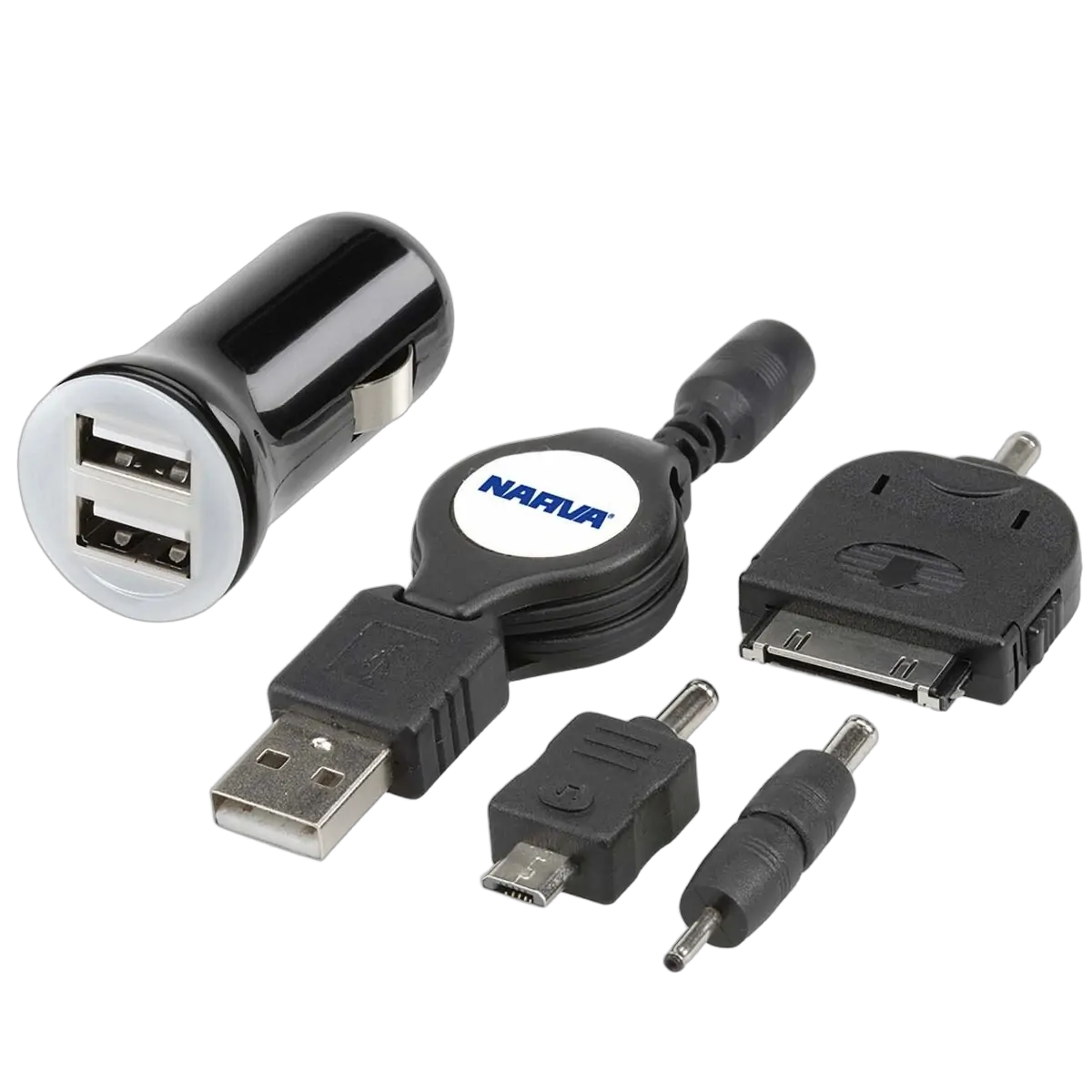 An all-in-one kit ideal for powering modern electronic devices including tablets, PDAs, smart phones, GPS etc. Features a 75cm retractable adaptor lead for tangle free storage and 3 interchangeable tips including Micro USB, Apple® and Nokia® 2mm connectors. Suitable for use with 12V or 24V vehicles and power supplies. Output 5V, 2.5A