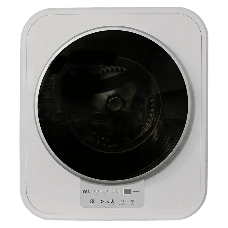 Stylish front load 240V washing machine with 3.0kg washing capacity and direct-drive motor. Featuring 6 programmable wash settings, hot wash, normal wash, baby care, quick wash, spin cycle & tub clean. Low noise motor (no belts), no need for detergent container (pour the detergent directly into the tub), transparent door, and child-safe mechanism.