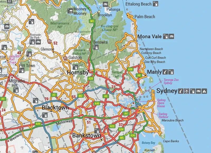 This state map of New South Wales is at a scale of 1:1,500,000 and includes national parks, points of interest, 24-hour fuel in addition to camping and rest areas. On the reverse side are through road maps of Sydney and Canberra, as well as the Sydney regional area. There is a full index included, as well as all national park information.