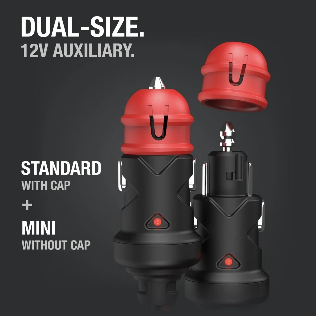 X-Connect 12V Male Plug X-Connect 12V Male Plug allows a battery charger to charge and maintain your vehicle's battery through 12-volt and 12-volt mini auxiliary ports. A built-in power LED indicator illuminates when the vehicle's 12-volt is active. Charge and maintain your battery from 12-volt and 12-volt mini auxiliary ports. LED indicator displays when the 12-volt auxiliary port is active. Built-in fuse protection for increased safety. More ways to charge with plug-n-play accessory changes. Rugged, watertight connector for extreme environments. WARNING: California’s Proposition 65
