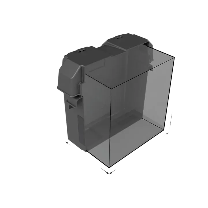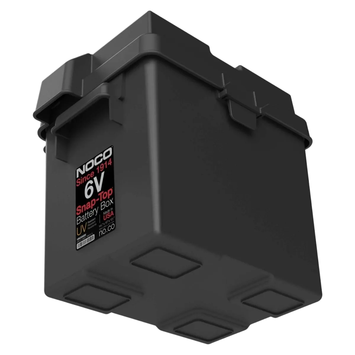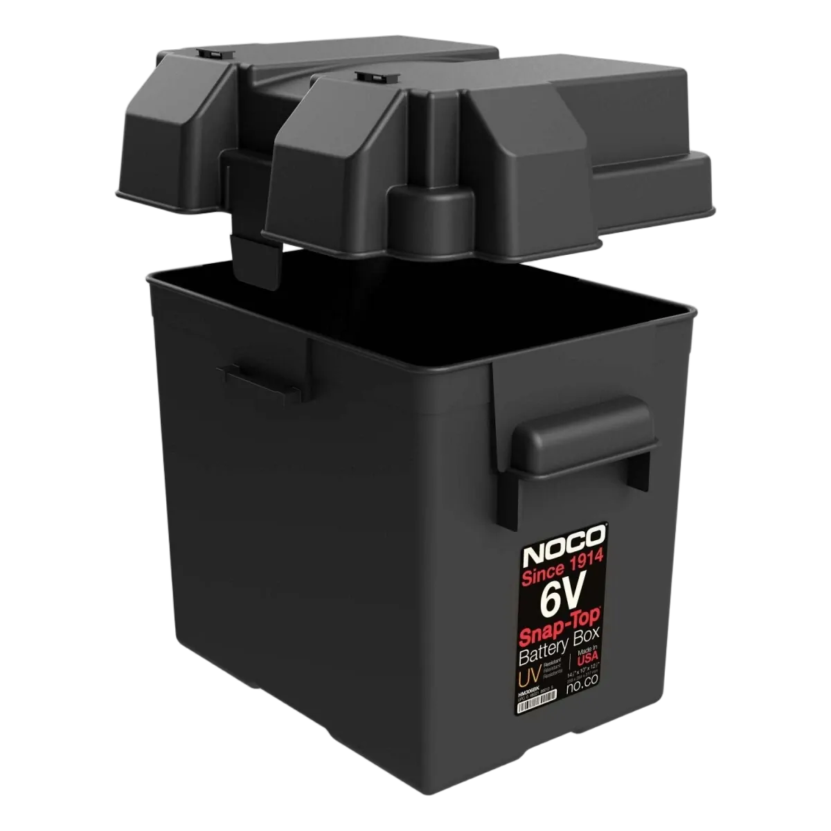 6-Volt Snap-Top Battery Box The HM306BKS Snap-Top Battery Box is a battery storage solution for sizes 6-volt Automotive, Marine, and RV batteries. It features locking tabs to fasten the cover securely to the battery case, reinforced plastic handles to prevent cracking during battery relocation, and allows adequate ventilation of battery acid vapours. This rugged battery box maintains its impact properties down to minus 20°F, as well as, resistant UV, oil, gas and other contaminants. Perfect installation in a car, boat, camper, motorhome, trailer, or caravan, as well as, generator equipment. Designed for a single 6-volt battery. Locking tabs to fasten the cover securely to the battery case. Impact and UV resistant, plus heavy-duty carrying handles. Fully ventilated to release battery gasses safely. Meets Coast Guard (USCG) Code of Federal Regulations 183.420. Meets American Boat and Yacht Council (ABYC) E-10.7. WARNING: California’s Proposition 65